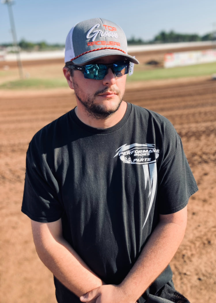 Pacific Headwear Rope Hat with snap back. Gray front white mesh back. Groove is white puff embroidery. Top Racewear is flat neon red